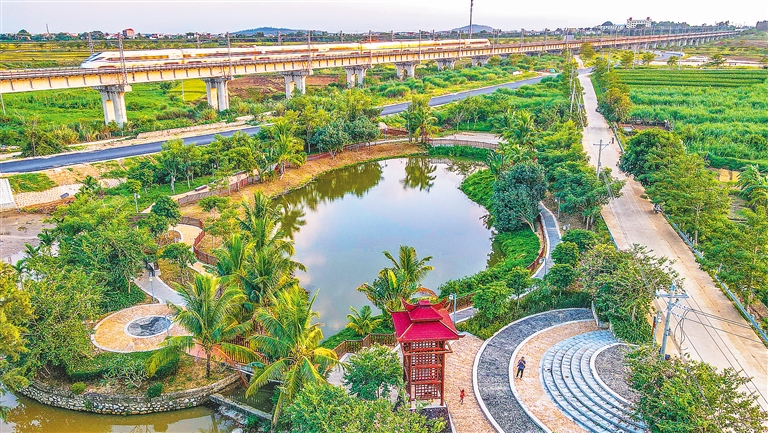 近日,在昌江黎族自治县乌烈镇道隆村乡村公园,一列动车从旁边飞驶而过。近年来,海南加快环岛高铁沿线环境整治和景观建设,居民游客出行目之所及多为美景。 本报记者 陈元才