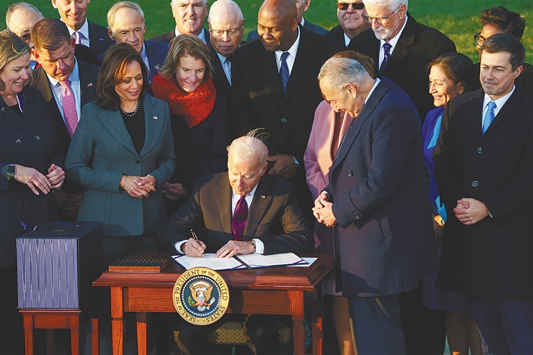 11月15日,美国总统拜登(中)在华盛顿白宫出席基础设施投资法案签字仪式。