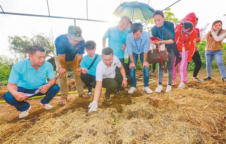 11月16日,澄迈县永发镇东兴村的澄迈润来种养殖农民专业合作社,工作人员为前来参观学习的农村实用人才带头人介绍蚯蚓粪和有机肥的制作流程和技巧。