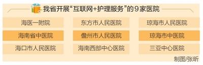 截至目前,我省共有海医一附院、海南省中医院、海口市人民医院、东方市人民医院、儋州市人民医院、海南西部中心医院、琼海市人民医院、琼海市中医院、三亚中心医院等9家医院陆续开展了“互联网+护理服务”,共计服务近2000人次。