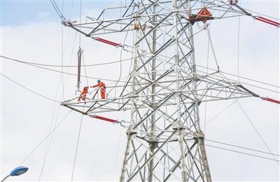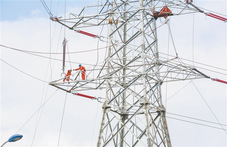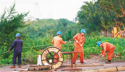 近日,在澄迈县老城经济开发区,南方电网工作人员正在对电网进行线路迁改,加快海南新型电力系统建设,增强电网供电可靠性。