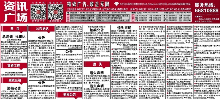 ●海南生资经济开发公司(统一社会信用代码:28407083-5)不慎遗失公章一枚,声明作废。