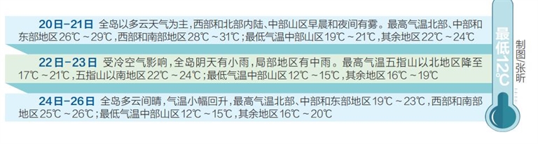本报海口11月19日讯 (记者习霁鸿 通讯员符晓虹 李凡 杨仁勇)据海南省气象台11月19日消息,预计未来7天(11月20日至26日),前期海南岛以多云天气为主,中后期受冷空气影响,全岛有降温、降雨天气过程,最低气温中部山区12℃~15℃,其余地区16℃~19℃。
