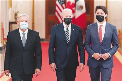 美国总统拜登、加拿大总理特鲁多和墨西哥总统洛佩斯18日在华盛顿就地区经济一体化、应对新冠疫情和气候变化等问题举行会谈。这是北美三国领导人5年来举行的首次峰会。 新华社/法新