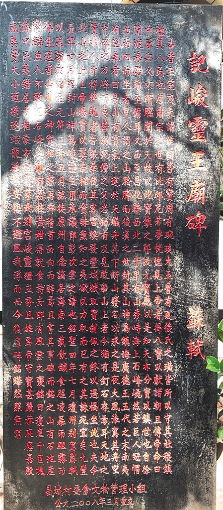 苏轼在儋州仅仅三年时间,关于峻灵王的文字也只有《峻灵王庙碑》一篇,如同昙花一现,但是却进一步推动人们对峻灵王的信奉。由于各种各样原因,苏轼撰写的碑文并没有被刻制成石碑以便大众观瞻。时隔二十多年后,南宋建炎二年(1129年),时任昌化县令的何適书写并刻碑苏轼《峻灵王庙碑》,此碑传承至今,遗憾的是已经残破。但是,这则古碑历经千年依然存在,很明显体现了人们对峻灵王极其尊奉,当然更有对苏轼的一份尊崇在其中。