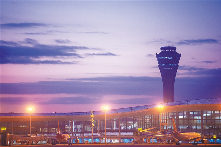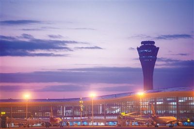 11月20日朝霞中的海口美兰国际机场新机坪塔台。当天上午8时许,该塔台和机场新运行控制中心正式投运。作为美兰机场二期投运先导项目,控制中心和新塔台将为美兰机场二期投运开启“加速度”。本报记者 袁琛 摄