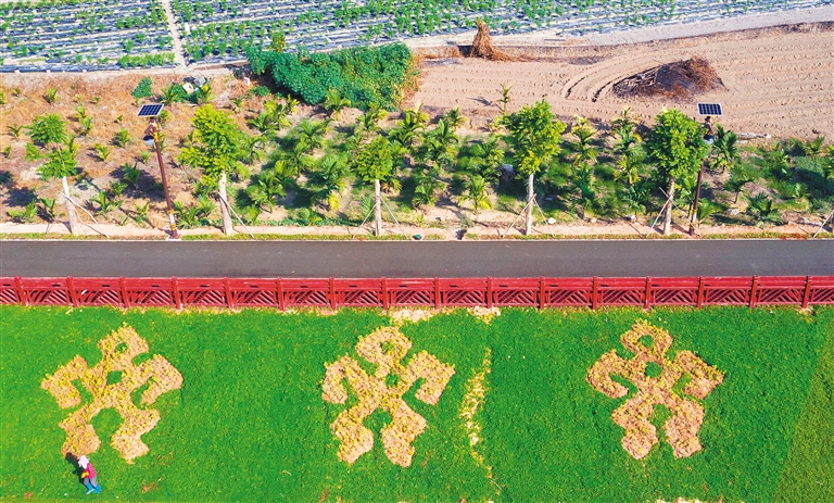 近日,保亭黎族苗族自治县保城河西河亲水绿道景观工程进入收尾阶段,预计今年12月完工并投入使用。据了解,保城河西河亲水绿道景观工程是保亭的重点项目,该项目位于保城镇凤凰路至什么东村保城河河段两侧,主要包括保城河河道两侧总长约1.5公里的绿道建设,及道路两侧绿化工程、休憩广场节点建设、服务中心等内容。图为保亭保城河西河亲水绿道景观工程融入黎族元素的图案。本报记者 李天平 摄