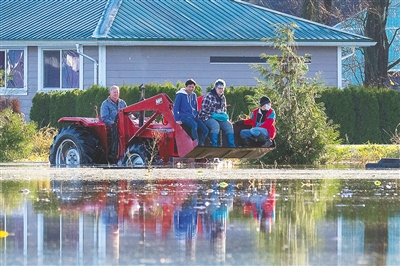 11月19日,人们在加拿大不列颠哥伦比亚省乘拖拉机经过被洪水淹没的区域。