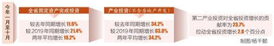 产业投资规模扩大。分产业看,第二产业投资增长较快,对全省投资的支撑作用明显增强。1月至10月,第一产业完成投资较去年同期增长2.8%,较2019年同期增长245.4%,两年平均增长85.8%;第二产业完成投资较去年同期增长24.2%,较2019年同期增长34.9%,两年平均增长16.1%;第三产业完成投资较去年同期增长10.1%,较2019年同期增长18.1%,两年平均增长8.7%。1月至10月,第二产业投资对全省投资增长的贡献率为23.7%,拉动全省投资增长2.8个百分点。