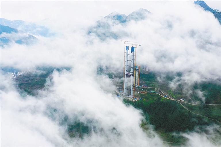 当日,随着最后一方混凝土浇筑完成,由中铁广州局承建的贵州金(金沙)仁(仁怀)桐(桐梓)高速桐梓河特大桥主塔成功封顶。据了解,该桥全长1422米,主跨达965米,主塔高208米,是全线重要的控制性工程。 新华社记者 刘续 摄