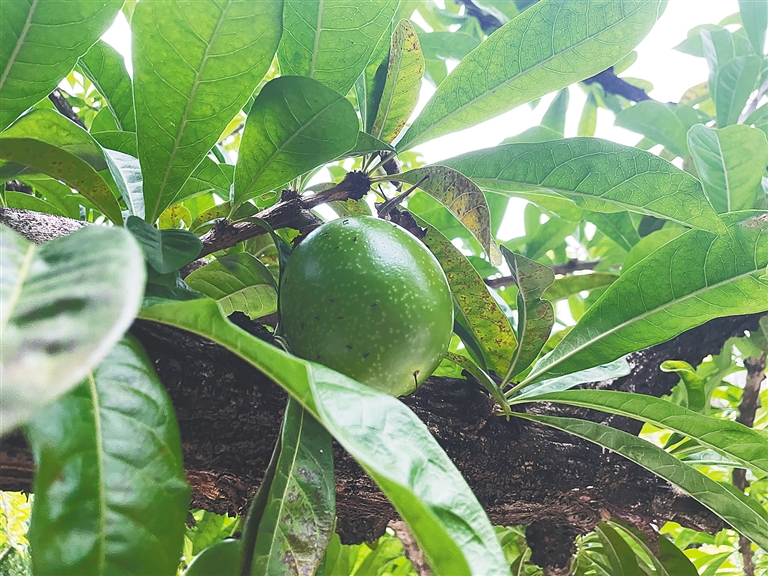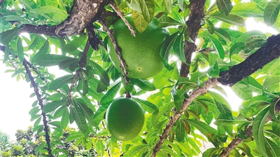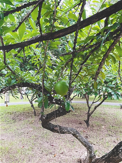这是一棵看似普通的树,种于三亚大东海广场,树姿秀丽挺拔,树叶繁茂苍翠,透着无限生机。未挂果时,它似乎与广场内其他树木并无多大区别,行人也极少驻足。而一旦树上结出如西瓜般大小的果实,总能吸引来往游客的注意,大家在拍照之余,便会围在树边七嘴八舌地讨论:这究竟是什么树?