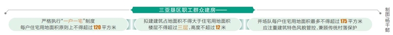 此外,《细则》还规定垦区职工、居民个人改建、重建和新建住房,每户住宅用地面积原则上不得超过120平方米,拟建建筑占地面积不得大于住宅用地面积,楼层不得超过三层,高度不超过12米。并场队的可根据土地资源状况、申请人的人口等情况适当放宽,但每户住宅用地面积最多不得超过175平方米;并要求垦区建房应注重建筑特色风貌管控,兼顾传统村落保护。建筑风格、体量、色彩、材质等需符合三亚垦区详细规划、三亚城市设计和建筑风貌管理实施细则等相关要求。此举进一步推动垦地双方空间规划的衔接和优化,有效推进三亚垦区职工群众建房规划纳入三亚市村庄规划体系。