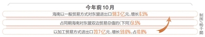 在商品品类方面,海南自东盟进口商品以农产品、基本有机化学品与能源类产品为主。今年1月至10月,海南自东盟进口农产品14.2亿元,增长29.3%;进口基本有机化学品18亿元,下降30.4%;进口煤13.7亿元,增长36%;进口液化天然气5.5亿元,增长18.9%。