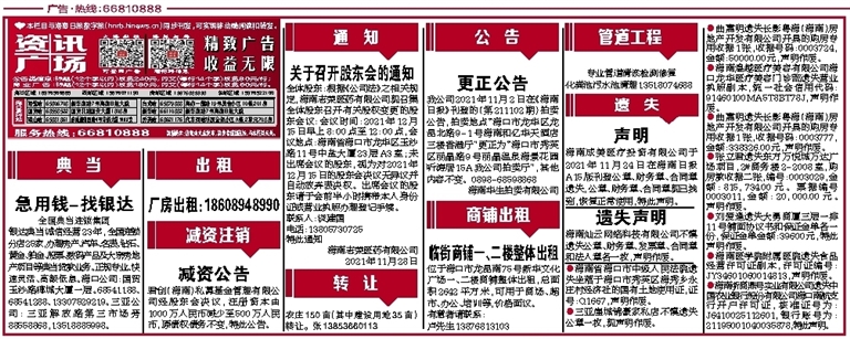 我公司2021年11月2日在《海南日报》刊登的(第211102期)拍卖公告,拍卖地点“海口市龙华区龙昆北路9-1号海南和亿华天酒店三楼香港厅”更正为“海口市秀英区丽晶路9号丽晶温泉海景花园听涛居15A我公司拍卖厅”,其他内容不变。0898-68598868