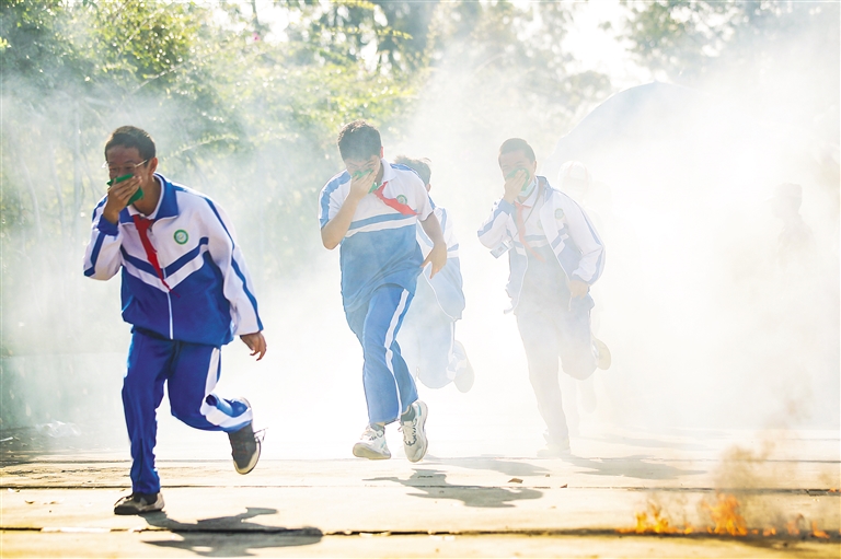 11月26日,来自海口市第一中学的学生们来到海南科教防灾减灾训练基地,通过防灾安全知识授课学习、应急逃生情景体验以及自救互救技能训练等形式,提高自身的生活技能和实践能力。图为学生现场体验模拟火灾现场逃生技巧。