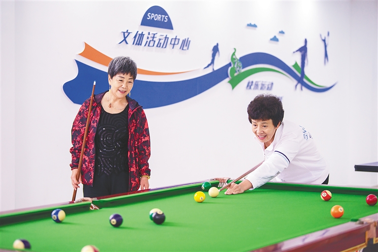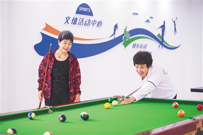 除了四点半课堂,记者注意到,“老年人日间照料驿站”“文体活动室”等教室也颇为热闹,自发前来的老人对这里一点儿也不陌生,熟练地操作着按摩椅、卡拉OK放映机等设备,有的则呼朋引伴打起了乒乓球赛、桌球比赛,不时传出欢声笑语。