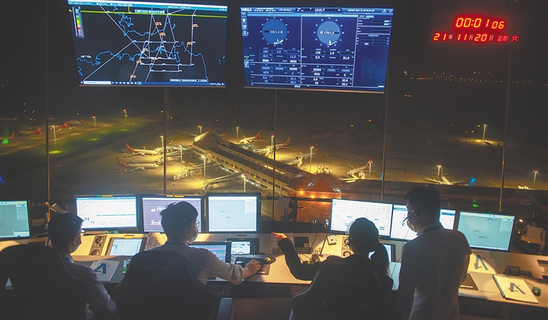 “夜间运行时塔台目视观察比较困难,需要飞行员通报和借助雷达才能及时掌握飞机落地位置及相关情况,所以晚上我们都会绷紧神经。”常值夜班的李言说,夜晚也是航班密集进港时段,塔台值班人员要全神贯注地盯着各自的雷达显示器,实时注视着每架飞机的方向、高度,及时向飞行员发出可以降落的指令。