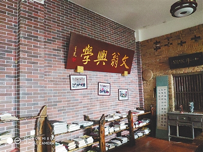 曾在大企业工作多年,让文盛飞有了更广博的见识。他用心“雕琢”溪边村的每个角落,让这里更有文化气息。村中的一栋传统瓦房建筑就是溪边书屋。书屋大厅正中间挂着木刻临摹的唐代画圣吴道子所绘孔子像,画像旁边木刻拓印的是东晋书法家王羲之书写的对联——“文章移造化,忠孝作良图”,圣人、画圣和书圣在书屋内“相聚”,足见书屋运营者的用心。溪边书屋的大门是敞开的,这里既是万宁市图书馆溪边分馆,也是村里的党员夜校教学点和溪边小学实践基地。书屋里摆放着两张大长桌,散发着浓浓的墨香。文盛飞说,村里的孩子每周都要在这里练书法,“我们合作社专门请来书法老师,孩子们学了两年,字都写得有模有样了。”