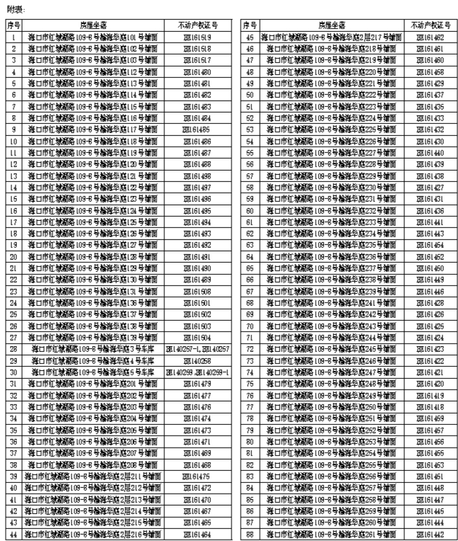 本院立案执行申请执行人张群辉与被执行人包萌、林金田房屋买卖合同纠纷一案,因被执行人至今未履行生效法律文书确定的义务,本院拟将位于海南省海口市红城湖路109-8号榆海华庭的85套铺面以及3套车库(详见附表列明的房号)的不动产权办理登记至申请执行人张群辉名下。如案外人对上述财产权属有异议,应自本公告发出之日起15日内,向本院提交书面异议并附相应证据材料。逾期,本院依法处置。特此公告。