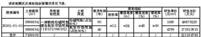 根据有资质的土地评估中介机构评估,并经评估专家小组评审通过,该宗地土地评估总价为22119.8738万元。其中:1.仓储用地的土地评估单价为1380元/㎡(折合92万元/亩),土地评估价为4967.5225万元。2.批发市场用地的土地评估单价为4765元/㎡(折合317.67万元/亩),土地评估价为17152.3513万元。该宗地在办理农用地(未利用地)转用及征收手续时,占用农用地7.1921公顷,其中耕地5.3621公顷(其中水田4.9615公顷、可调整其他园地0.4006公顷)。可调整其他园地按水田开垦费用标准管理,根据我市近期异地补充耕地指标价格标准,水田开垦费用标准为40万元/亩,则该宗地耕地开垦费为3217.26万元。再根据《海南省实施〈中华人民共和国耕地占用税暂行条例〉办法》(海南省人民政府令第217号)的规定,三亚市耕地占用税适用标准为35元/平方米,该宗地耕地占用税为251.7235万元。综上,该宗地土地评估价、耕地开垦费和耕地占用税合计25588.8573万元。因此,确定该宗地挂牌出让起始价为25589万元。该宗地采取“先租后让”方式供应,土地用途分别为仓储用地和批发市场用地,其中,仓储用地的法定最高出让年限为50年,本次“先租后让”的租赁年限为10年,后续出让年期为40年;批发市场用地的法定最高出让年限为40年,本次“先租后让”的租赁年限为10年,后续出让年期为30年。该宗地土地总价款按以挂牌方式公开交易的土地成交价格确定,年租金为土地总价款的5%,租赁期满转出让时应缴纳的协议出让价款等于土地成交总价款减去已缴纳的租金。租赁期价款和租赁期满转出让价款均为一次性缴纳。根据《海南省建设用地出让控制指标(试行)》规定,鉴于控规BG02-01-01地块在省级六类产业园区范围内,地块规划用地性质为一类物流仓储用地混合批发市场用地,拟建设果蔬批发市场项目,属现代物流业中的仓储用地和批发市场用地,不设出让控制指标。但根据三亚崖州湾科技城管理局出具的《关于三亚崖州湾科技城西北片区控规BG02-01-01地块竞买资格条件及开发建设要求的函》(三科技城函〔2021〕1385号),确定该宗地的投资强度指标为不低于200万元/亩,年度产值及年度税收不设出让控制指标。以上出让控制指标按规定列入《海南省产业项目发展和用地准入协议》,属该协议内容的组成部分。(二)开发建设要求:1.竞买人须在竞买初审前与三亚崖州湾科技城管理局对接,充分知晓该宗地《海南省产业项目发展和用地准入协议》内容,并向三亚崖州湾科技城管理局出具书面承诺,如竞得该宗国有建设用地使用权,则将严格按照该宗地《海南省产业项目发展和用地准入协议》规定的要求进行项目开发建设。同时,竞得人须在签订《挂牌出让成交确认书》后5个工作日内与三亚崖州湾科技城管理局签订《海南省产业项目发展和用地准入协议》,并严格按照《海南省产业项目发展和用地准入协议》约定内容进行开发建设,否则将承担相关违约责任。竞得人应当在租赁期满前6个月向三亚崖州湾科技城管理局提出考核评价申请,三亚崖州湾科技城管理局对准入协议的履行情况进行考核评价。经考核评价合格,达到履约条件的,由三亚市自然资源和规划局按照协议出让方式办理用地审批和土地登记等手续;考核评价不合格的,允许竞得人限期整改,整改期最长不超过1年。整改期满考核评价仍不合格的,不得办理协议出让土地手续,三亚市人民政府可依照合同约定收回土地使用权,处置地上建筑物、构筑物和其他附属设施,并追究竞得人相关违约责任。2.竞得人可持签订的土地租赁合同、土地租金及相关税费缴纳凭证等,申请办理不动产登记。同时,竞得人可持租赁的不动产权证书依法办理规划报建等手续。3.竞得人取得土地使用权后,要严格按照规划要求和合同约定,及时动工兴建,并按合同约定期限建成,若在规定的期限内不能建成,应向市人民政府申请延期。否则,市人民政府将依法无偿收回土地使用权。4.竞得人未依照土地使用权租赁或者出让合同约定的期限和条件投资开发的,不得转租、转让土地使用权。同时,竞得人应当按照土地租赁和出让合同约定的用途使用土地,未经批准不得改变土地用途。竞得人未按照合同约定缴纳租金、土地出让金或者不按照合同约定进行开发建设,擅自转租、转让、改变土地用途,按照有关法律法规和合同约定追究法律责任。5.该宗地项目建设应采用装配式建筑方式建造,装配率不得低于50%,且需符合装配式建筑相关规定(具体按照三亚市住房和城乡建设局要求执行)。6.该宗地项目在设计全过程中使用BIM技术进行设计,在申请建设工程规划报建时,应按三亚崖州湾科技城BIM交付标准提交相应阶段的BIM模型及相关设计成果,并在项目施工过程中按照《三亚崖州湾科技城管理局关于印发〈三亚崖州湾科技城管理局关于加快推进三亚崖州湾科技城“智慧工地”建设的指导意见〉与〈三亚崖州湾科技城“智慧工地”建设标准〉通知》(三科技城〔2020〕279号)的要求对建筑工程实行智能化管理。7.根据海南省自然资源和规划厅、 海南省住房和城乡建设厅和海南省市场监督管理局联合下发的《关于加强商业、办公类建设项目全过程管理的意见》(琼自然资规〔2021〕12号),该宗地中的批发市场用地应当严格按照该意见规定执行,禁止将该项目变相改造为具备长期居住功能的“类住宅”建筑的行为。8.