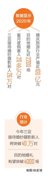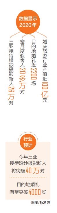20多年的培育,婚庆旅游产业在三亚释放出强劲的活力。数据显示,2020年,三亚接待婚纱摄影新人26万对,蜜月度假客人20多万对,目的地婚礼近2200场,婚庆旅游行业产值近100亿元。行业预计,今年三亚接待婚纱摄影新人将突破40万对,目的地婚礼有望突破4000场,婚庆旅游市场活力充沛,仍蕴藏着巨大的潜力。
