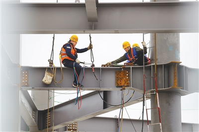 近日,在海口江东玖龙总部项目施工现场,工人正在进行钢结构的吊装、钢筋绑扎及混凝土浇筑等工作。