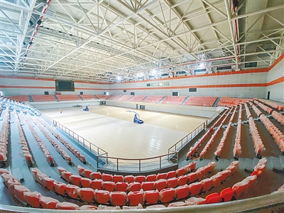 图②为体育馆内装修加速,场馆座椅整齐摆放。
