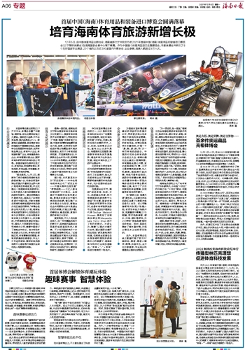 为期三天的2021年首届中国(海南)体育用品和装备进口博览会(以下简称体博会)于12月3日启幕,这场汇聚全球顶级体育资源的全国首个体育用品进口主题博览会备受关注,岛内外游客接踵而至。展商们带来的奥林匹克文化、体育用品、体育教育培训、体育旅游、体育金融、体育健康、体育竞赛、体育科研等内容将让你“一站式”解锁体育潮玩体验。
