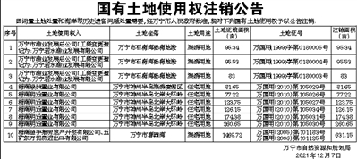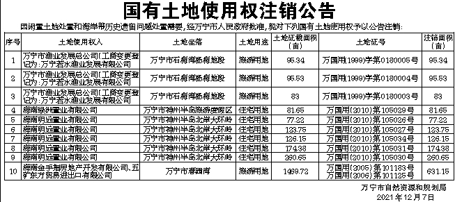 因闲置土地处置和海岸带历史遗留问题处置需要,经万宁市人民政府批准,现对下列国有土地使用权予以公告注销: