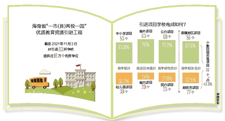 2017年,省委、省政府启动海南省“一市(县)两校一园”优质教育资源引进工程,以高位嫁接“优质基因”的方式,在每个市县至少引进1所省级优质中学、1所小学和1所幼儿园,以此辐射带动周边基础教育水平实现稳步提升。