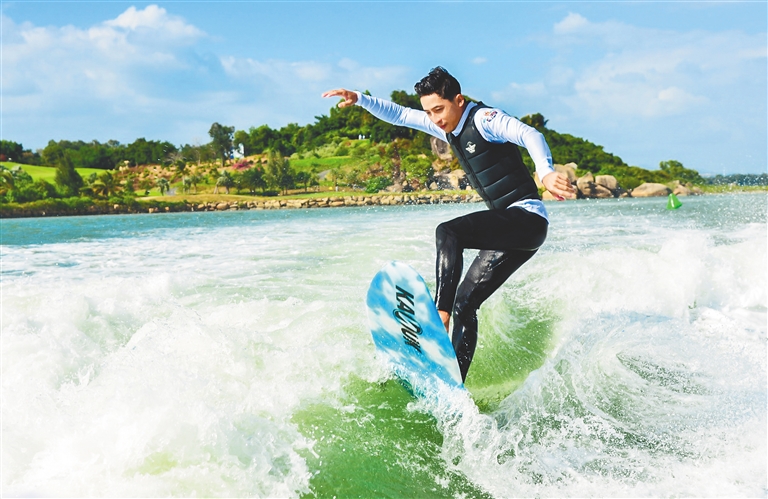 据悉,尾波冲浪是近年来兴起的滑水项目,将冲浪元素糅合于滑水项目中,冲浪者可自由站在冲浪板上,借助滑水艇导流槽造出的齐膝卷浪持续做出不同的花式动作,兼有运动和娱乐的趣味。近年来,凭借得天独厚的自然条件以及社交平台的传播推广,尾波冲浪逐渐在三亚兴起,吸引不少游客前来“打卡”体验。 文/本报记者 徐慧玲 图/本报记者 武威
