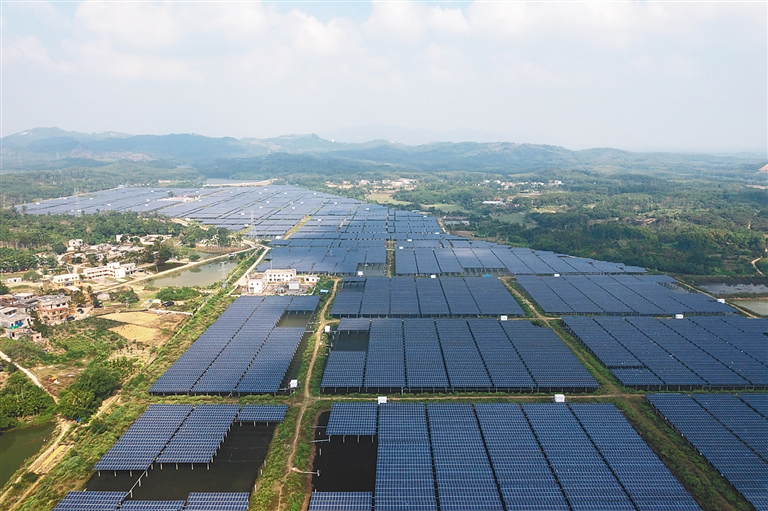12月10日,在屯昌县屯城镇大长坡村,兴业太阳能渔光互补示范项目的太阳能光伏板整齐排列。项目工程通过水面打桩,以固定方式安装光伏组件建设光伏发电站,鱼塘养殖功能不受影响。
