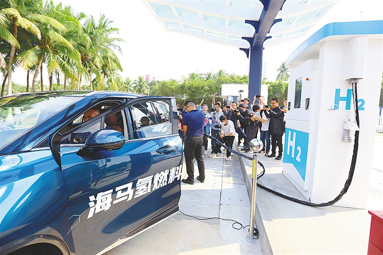当天,海马汽车董事长景柱与嘉宾们共同为海口光伏制氢高压加氢一体站剪彩,并为该站第一台清洁能源汽车加氢。