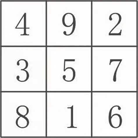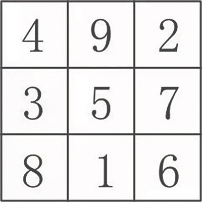 在洛书中,除了纵向、横向和对角线上的三数之和都为15外,四边每侧的两数之差均为5,即上9-4=5、下6-1=5、左8-3=5、右7-2=5。此外,除了居中的5之外,洛书九宫格其他数字可以有规律的左旋或右旋,或上下、前后调换,而纵向、横向和对角线上的三数之和始终是15,由此构成更加复杂的数学魔方,这些都是可以继续探索的。