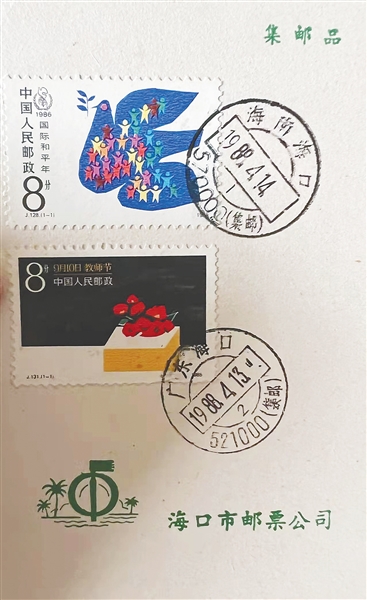在彭全盛的收藏中,有一张特别的邮品。它由海口市邮票公司发行,上面贴着两张邮票,每张邮票上分别盖着一个邮戳:一为“1988.4.13,广东海口”;另一个为“1988.4.14海南海口”。“这是首尾戳,非常有纪念意义。因为海南是1988年4月26日正式挂牌建省,所以在此前还是印着广东、海南两个邮戳。”彭全盛说。