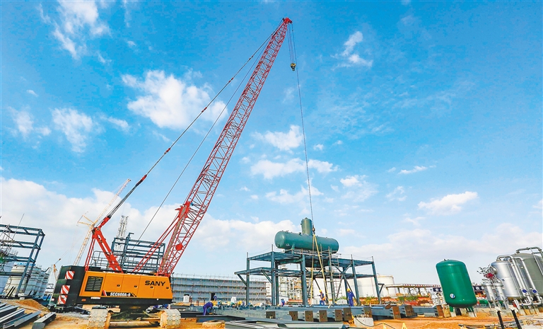 日前,在位于东方临港产业园的海南精细化工项目二期丙烯腈项目施工现场,工人正在吊装设备。目前项目推进顺利,预计本月底完成大型设备进场。项目总投资为27.8亿元,总体建设进度完成82.5%。 文/本报记者 刘婧姝 图/本报记者 陈元才