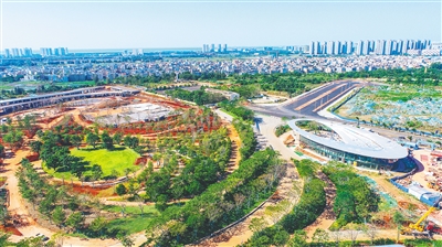 近日,航拍正在建设中的海口西海岸南片区公园示范区。目前,该公园游客中心和水上剧场的主体工程已完成,进入装修阶段。本报记者 张茂 摄