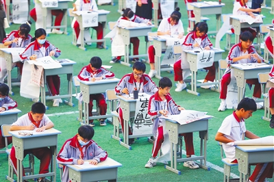 12月10日,在海口市城西中学操场,上百名学生分别进行硬笔和毛笔字比赛。