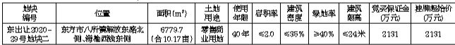 该宗地符合我市土地利用总体规划,已列入我市今年建设用地供地计划。目前该宗地土地权利清晰、安置补偿落实到位、地上附着物清表、无法律经济纠纷、土地开发利用规划条件明确、符合土壤环境质量要求、具备动工开发所必须条件的净地。二、竞买事项:(一)中华人民共和国境内外的法人和其他组织(除法律另有规定者外)均可参加竞买(注:失信被执行人不得参加本次竞买)。属境外机构(含港、澳、台地区)申请参加竞买的,按照规定需要提交商务主管部门核发的《外商投资企业批准证书》和工商主管部门核发的《营业执照》。本次挂牌出让地块不接受联合竞买;必须在挂牌出让公告规定的时间内把竞买保证金存入东方市自然资源和规划局指定账户(以挂牌竞买保证金入账时间为准)。(二)具有下列行为的法人和其他组织不得参加本次土地出让挂牌:1、在东方市范围有拖欠土地出让金行为,并未及时改正的;2、在东方市有闲置土地、违法利用农村集体土地建设商品住房、擅自改变土地用途等违法行为,并未及时纠正的。3、在东方市范围有非法占地、违法建设行为的。(三)出让方式和竞得人确定原则:该地块国有建设用地使用权采取公开挂牌方式出让,并按照价高且不低于底价者得的原则确定竞得人。(四)本次挂牌出让宗地的详细资料和具体要求(详见挂牌出让文件)。申请人可于2021年12月15日至2022年1月12日到东方市自然资源和规划局办公楼二楼权益和开发岗(或海南省公共资源交易服务中心一楼受理大厅3号窗口)获取挂牌出让文件及向我局提交书面申请。交纳竞买保证金的截止时间为2022年1月12日17时。经审核,申请人按规定交纳竞买保证金,具备申请条件的,东方市自然资源和规划局将在2022年1月12日17时前确认其竞买资格。(五)本次国有建设用地使用权挂牌出让活动在海南省政府会展楼二楼省公共资源交易服务中心土地交易厅进行。挂牌起始时间为:2022年1月4日8时30分;挂牌截止时间为:2022年1月14日11时30分;挂牌现场会时间为:2022年1月14日11时30分。(六)挂牌时间截止时,有竞买人表示愿意继续竞价的,转入现场竞价,通过现场竞价确定竞得人。(七)本次挂牌出让不接受电话、信函、电子邮件及口头竞买申请。三、开发建设要求:1.该地块若实施装配式建筑,应按装配式建筑有关规定执行。2.竞买人竞得该宗地后需配套建设文化设施面积占商业地块计容建筑面积的50%,即计容建筑面积6779.7平方米。3.其他未尽详列的应根据国家、省、市有关政策及规范要求执行。四、其他事项:1、竞买成交当天签订《成交确认书》,并在30日内与东方市自然资源和规划局签订《国有建设用地使用权出让合同》。竞买保证金自动转作受让地块的出让价款。土地出让金按《国有建设用地使用权出让合同》的约定支付,合同约定一次性缴纳土地出让金的,应从合同生效之日起90日内付清土地出让金;合同约定分期缴纳土地出让金的,分期缴纳全部土地出让金的期限不得超过1年,首次缴纳比例不得低于全部土地出让金的60%。逾期未付清土地出让金的,土地行政主管部门有权依法解除合同,并由受让人承担相应的违约责任。竞得人缴纳的竞买保证金自动转做出让地块的出让金。2、挂牌出让金不含各种税费,挂牌佣金和公证费按有关规定收取。3、挂牌的地块以现状条件出让。本次挂牌出让事项如有变更,以届时变更公告为准。4、本公告未尽事宜详见《东方市国有建设用地使用权挂牌出让手册》,该手册所载内容为本公告的组成部分。联系人:陆先生 欧阳先生;联系电话:0898-25585295 68529777;http://www.landchina.com;http://lr.hainan.gov.cn/;http://zw.hainan.gov.cn/ggzy/
