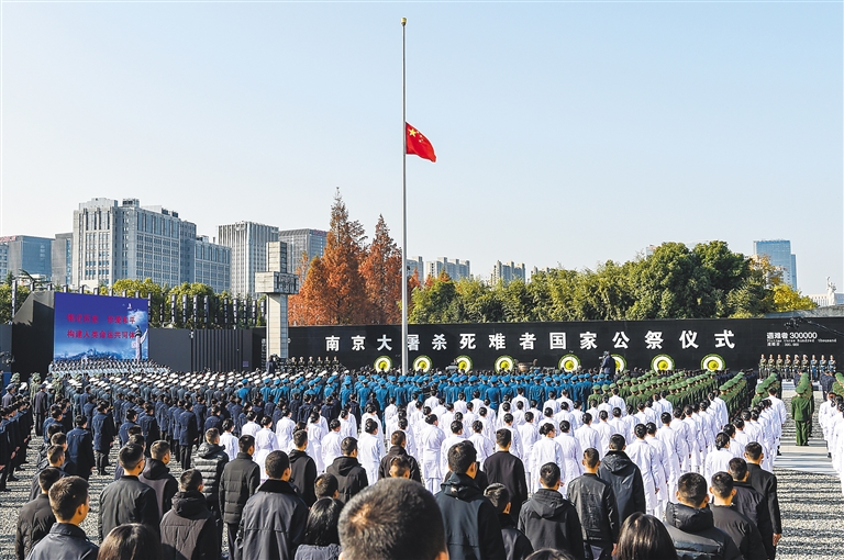国行公祭,祀我殇胞。公祭仪式在侵华日军南京大屠杀遇难同胞纪念馆集会广场举行,现场庄严肃穆,国旗下半旗。约3000名胸前佩戴白花的各界代表静静肃立。10时整,仪式开始,全场高唱《中华人民共和国国歌》。国歌唱毕,全场向南京大屠杀死难者默哀,南京市拉响防空警报,汽车停驶鸣笛,行人就地默哀。默哀毕,在解放军军乐团演奏的《国家公祭献曲》的旋律中,解放军仪仗大队16名礼兵抬起8个花圈,敬献于公祭台上。