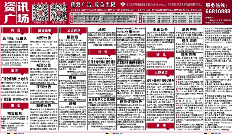 我公司于2021年12月8日于海南日报A09版刊登的拍卖公告中,错把拍卖标的中的A包(黄流南繁基地及万豪酒店堆沙方)数量写成1357190.4平方米,其实际数量应为135719.4平方米。