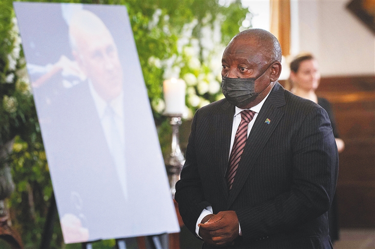 12月12日,南非总统拉马福萨在开普敦参加为前总统德克勒克举行的追悼仪式。