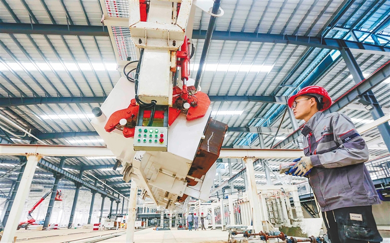 12月13日,在位于临高金牌港园区的海南康庄住工建筑公司装配式建筑产业基地,工作人员正在调试设备。目前,该项目已经进入试运营阶段。