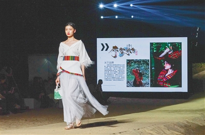 黎锦主题时装秀现场,海南本土知名音乐唱作人、黎族青年歌手阿侬子黎带来他的最新专辑单曲《岛歌》《黎想的家》。伴随着轻快悠扬的音乐声,模特们身着结合现代曲线美和民族特色的秀款服饰缓缓走出。设计师结合现代时尚元素,设计制作了黎族传统文化标识鲜明的精美手工服饰,既体现浓郁的黎族文化特色,又紧跟潮流,与大海、星空、椰树、花草等天然背景完美融合,充分展示了人与自然和谐相处的美好景象,为观众带来一抹琼岛民族时尚风情。