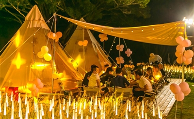 省内一些景区陆续推出了露营地,同时再搭配户外电影、篝火晚会、海上运动等。“老牌景区”天涯海角游览区打造了星空营地,将诗和远方、音乐、美食、美酒、娱乐融为一体,当夜幕降临,灯光点亮,游客围坐一起,谈天说地,氛围舒适惬意。