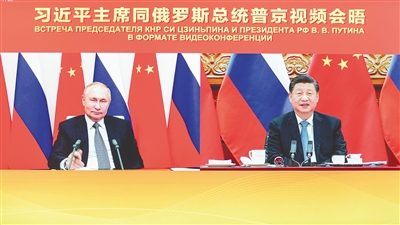 习近平强调,当前,世界百年变局和世纪疫情交织影响,世界进入动荡变革期。中俄关系经受住各种风浪考验,展示出新的生机活力。我同总统先生通过多种方式就重大议题保持沟通和协调,共同为中俄关系把舵领航。双方正式宣布《中俄睦邻友好合作条约》延期并赋予其新的时代内涵,在涉及彼此核心利益问题上坚定相互支持,捍卫了各自国家尊严和两国共同利益。