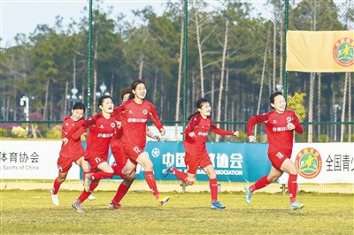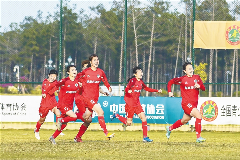 12月15日下午,在福建漳州举行的2021年中国足球协会女子乙级联赛半决赛中,海南琼中女足队惊险击败武汉体院女足,成功晋级决赛并拿到2022年女子中甲联赛的“入场券”。图为比赛获胜后琼中女足队员飞奔庆祝。