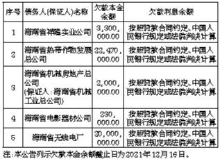 根据《债权转让协议》,海南联合资产管理有限公司(原海南联合资产管理公司,下同)已从金融机构收购了原发生于中国农业银行的对下列债务人、保证人和担保人的债权及附属从权利。海南联合资产管理有限公司作为债权(包括贷款本金、利息及其他权利)的受让方,现公告要求债务人、担保人及其他义务人立即向海南联合资产管理有限公司履行相应合同约定或法院判决所确定的义务(若债务人、担保人及其它义务人因各种原因更名、改制、歇业、吊销营业执照或者丧失民事主体资格,请相关承债主体、清算主体代为履行义务或者承担清算责任)。