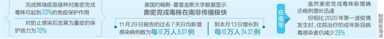 美国约翰斯·霍普金斯大学数据显示,奥密克戎毒株在南非传播极快,11月29日报告的过去7天日均新增感染病例数为每10万人8.07例,到本月13日增长到每10万人34.37例。