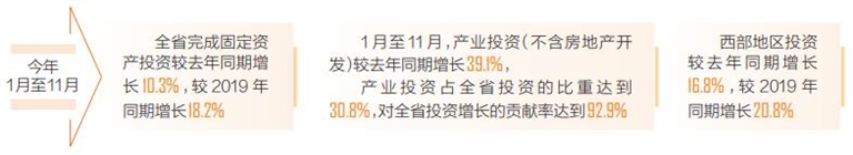 从新开工项目投资情况来看,新开工项目投资增速持续提升,对全省投资的平稳增长发挥重要支撑作用。1月至11月,本年新开工项目完成投资较去年同期增长18.1%,高出全省投资增速7.8个百分点,较2019年同期增长18.0%,两年平均增长8.6%。新开工项目完成投资占全省投资比重的27.0%,对全省投资增长的贡献率达44.4%,拉动全省投资增长4.6个百分点。